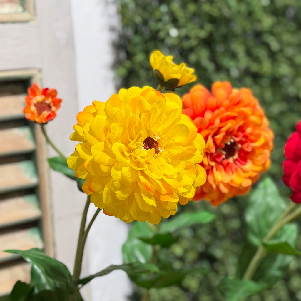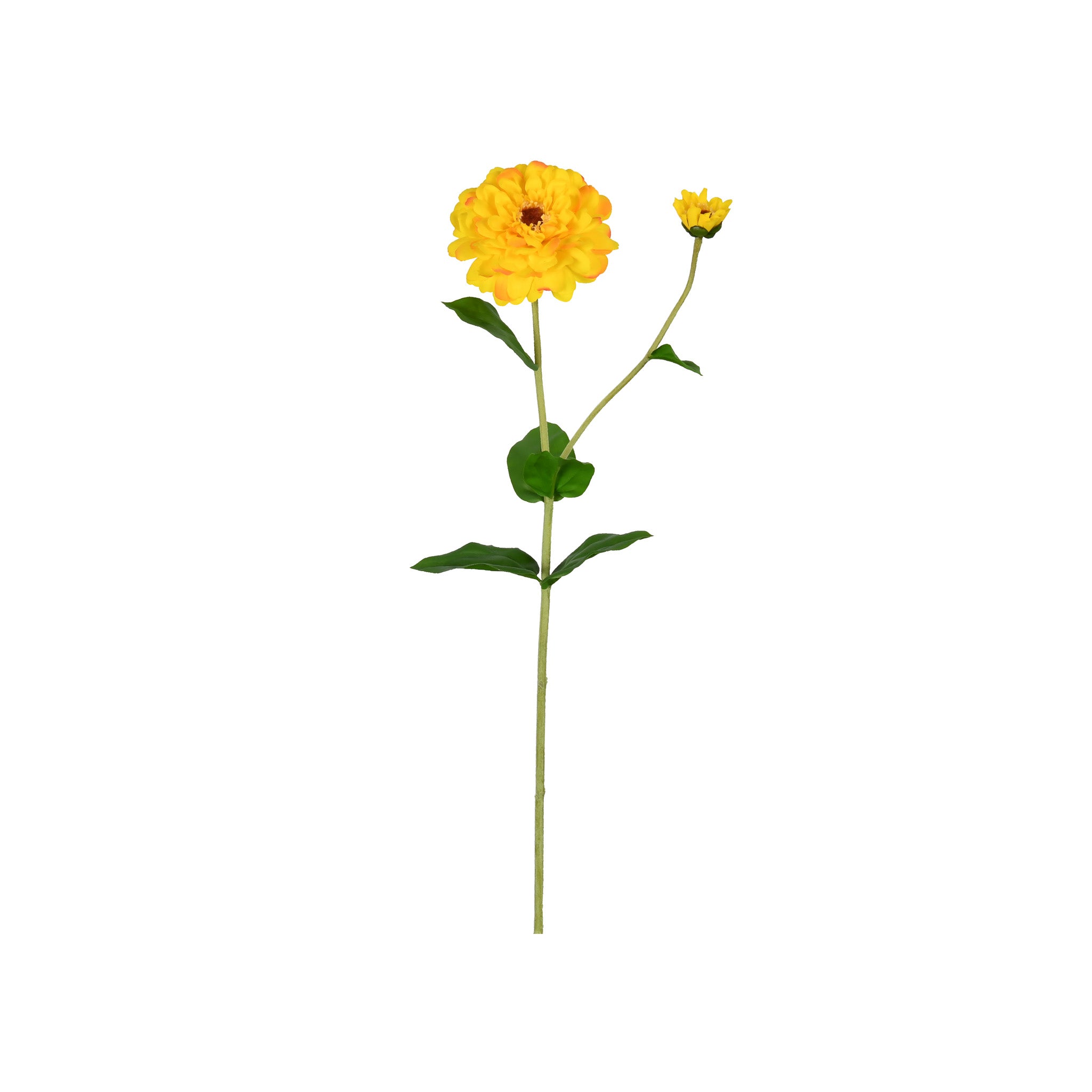 Bright and cheerful, this 26-inch Yellow Zinnia Flower Stem captures the sunny vibrance of a garden in bloom. Featuring a lush, open yellow zinnia alongside a budding flower, this faux stem brings a lively touch of warmth to any arrangement. The rich green leaves enhance the realistic look of the zinnia’s vibrant petals, making it a perfect choice for adding a pop of color to floral displays or as a simple, standalone accent. Enjoy the beauty of fresh flowers without the need for upkeep—this yellow zinnia stem delivers lasting charm and brightness to any decor.